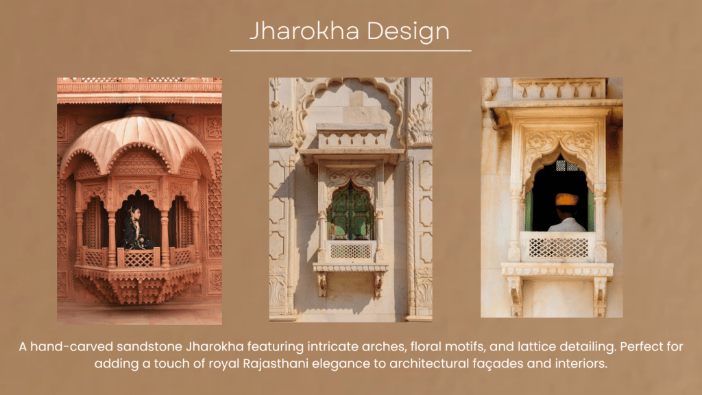 Hand-carved Rajasthani jali and traditional jharokha window designs.