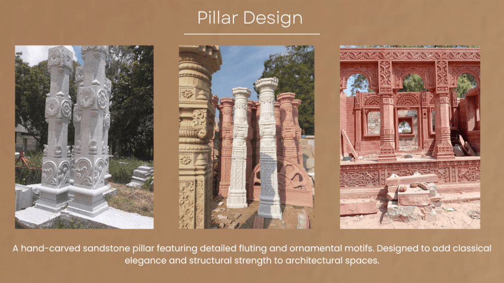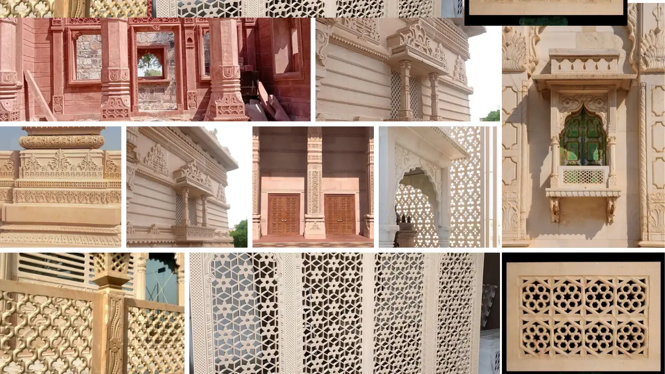 हम मंदिर निर्माण, पिलर डिज़ाइन, जाली-झरोखा, मेहराब, स्टोन क्लैडिंग से लेकर फाउंटेन और कस्टम स्टोन आर्ट तक सभी प्रकार के कार्य विशेषज्ञता से करते हैं।